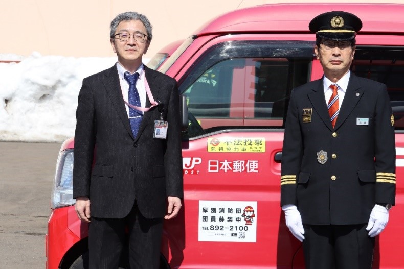 花田団長は「厚別消防団では、団員の成り手を確保することが大きな課題となっています。厚別区内を隈なく走る郵便車両の協力を仰ぎ、消防団員募集のアナウンスをすることで地域のみなさまが消防団に興味を持ってくれると思います。厚別郵便局様のご協力にお礼申し上げます。」と感謝の言葉を伝えると、中郵便局長から「郵便局の日常業務で、地域に貢献できることを嬉しく思います。今回の試みが厚別消防団の発展に繋がることを期待しています。」と話していました。