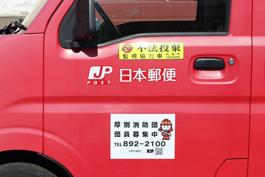 札幌市厚別消防団(花田了彰団長)では、厚別郵便局(中 一彦郵便局長)の協力により、同郵便局の郵便車両(厚別区内担当の四輪車51台、二輪車66台)に消防団員募集ステッカーの掲載を開始しました。