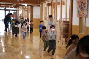 訓練は「一階厨房から火災が発生」との想定で行なわれ、園児及び職員は口や鼻にハンカチを当て遊戯ホールに避難しました。