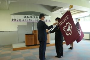 女性分団の佐藤京子分団長は、授与された分団旗をしっかりと握りしめ、「ソフト面を生かした消防団活動を今まで以上に広げていきます。」と力強く抱負を語りました。