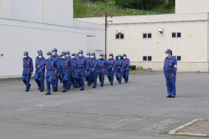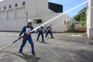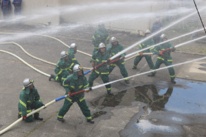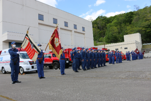 当日は、消防職・団員及び消防関係者など70名、消防車両8台が参加して、分列行進や小隊訓練、ポンプ車操法を行い、最後に消防車3台による一斉放水を実施し、演習を終了しました。