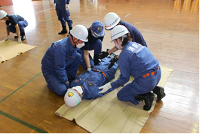 研修は、バケツリレー、救助器具を活用した救出訓練、応急担架等での搬送訓練、ロープ結索の4ブースに分かれて実施し、参加した消防団員は各講師から防災資機材の取扱いの指導要領、指導する際の注意点などについて、受講しました。