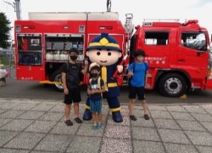 会場に登場した着ぐるみ「消太5号」は、防火衣とヘルメットを着装しての放水体験では横でおもちゃの管槍を持って放水の真似をしたり、たくさんの子どもたちと一緒に消防車と記念撮影をするなど大人気で、子どもと一緒に来場していた両親や祖父母等を含め、夏祭りに訪れた幅広い層への防火PRに大きく貢献しました。