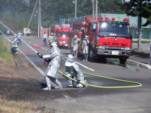 昭和47年に発足した当消防事務組合の設立50周年の節目にあたる今年は、新型コロナウイルス感染症拡大防止のため、大会規模を縮小しての開催となりましたが、令和2年度に新たに当分会に加入した幌加内町消防団を迎えて、消防職・団員ら192名、消防車両21台が参加して分列行進、模擬火災訓練を実施しました。