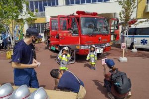 消防本部からは、消防車1台と救急車1台を展示し、多くの子供たちが火災現場や救急現場で活躍する車両と、防火衣・ヘルメット・担架等の装備品に直に触れるとともに、各種現場における使用方法や注意事項などの職員の説明を真剣に聞いて、消防で「はたらく車」のことを学んでいました。