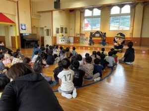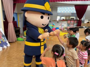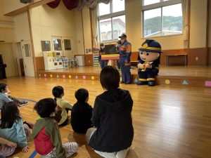 当日、子供たちは消防車の乗車体験や放水体験・煙道体験を行った後、女性消防団による防火紙芝居を見ました。防火紙芝居を一緒に見てくれるお友達として「消太5号」が登場すると、「可愛い!」との歓声があがりました。