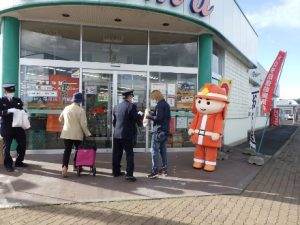 10月18日(火)に町内のAコープ雄夢店で実施した街頭啓発では、着ぐるみの消太4号とともに、訪れる町民に対して火災予防広報グッズ等を配布し、火災予防を呼びかけました。