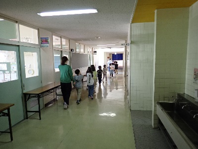 訓練は「1階機械室のボイラーから火災が発生した!」との想定で行なわれ、児童及び職員は口や鼻に手を当て学校前駐車場へ避難しました。