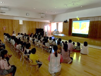 園児たちは、ボイラー室から火災が発生したとの想定で園庭まで一生懸命に避難した後、真剣な表情で「ぼくは小象の消防隊」、「やめて!ライターあそびどうぶつ村の消ぼう隊出どう」の2本の防火映画に見入っていました。
