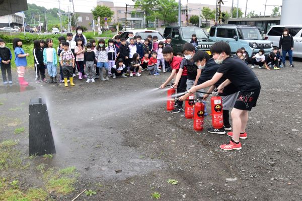 今回、子供たちは火災の発生を想定した避難訓練と水消火器を使用した消火訓練を実施した後、各施設のホール内で「火遊びは火事のもと‐ケンタとニャンタの火の用心-」と「桃太郎の火遊びをやめよう火の用心」の2作品を鑑賞しました。