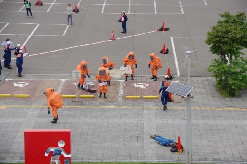 今回は応用注水訓練や救急処置訓練及び救助技術展示訓練を実施したほか、NBC災害対応訓練では駐車場を新千歳空港ターミナルビルに見立て、化学剤(サリン)により複数人が体調不良を訴えている想定で要救助者の救出、除染及び応急手当などの活動を展開しました。