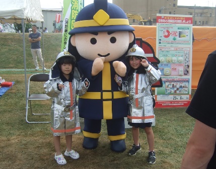 また、チビッ子達には着ぐるみの「消太くん」が人気で、防火服を着て記念撮影をしたり、ふれ合ったりして終始和やかな雰囲気の中のイベントとなり、消防のPRに大きく貢献しました。