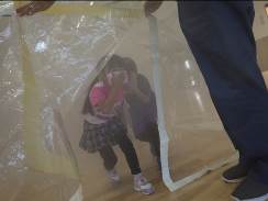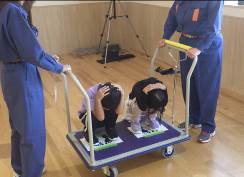 「防災体験」では、サイレンや緊急地震速報などの音を聞いてから、地震ブース、トンネル内のブロックの障害物を避けて通る脱出訓練、走って逃げる津波ブース等を色んなポーズを取りながら、地震発生から津波が来るまでの一連の流れを体験しました。子どもたちは、怖がりながらも「たぬきのポーズ」で煙の中を通り抜けました。