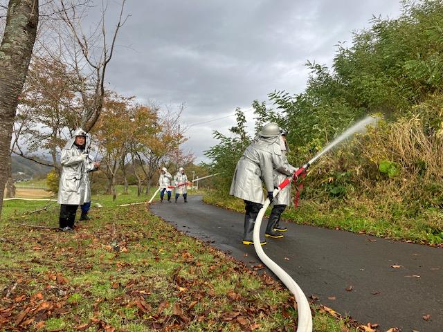 訓練は、尻別川河川敷の笹藪が延焼しているという林野火災を想定し、第1出動の職員隊が消火活動を行うも消防力は劣勢、消防団が第2出動して、職・団員が連携して消火するまでの実践さながらの演習となりました。