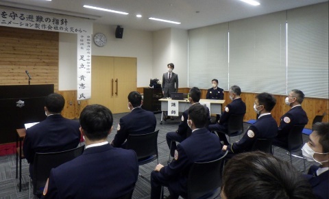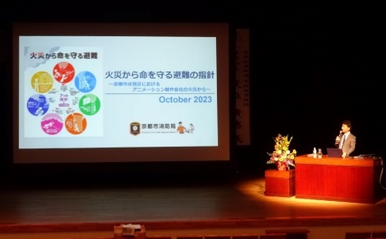研修会では、参加した職団員及び会員約250名に対して、講師の京都市消防局予防部の足立貴志予防課長から「火災から命を守る避難の指針~京都市伏見区におけるアニメーション制作会社の火災から~」というテーマで、火災時の壮絶な状況や生存者にスポットを当て生き残るための指針を策定するに至った経緯などの話があり、大変貴重な研修会となりました。