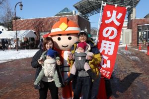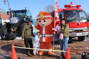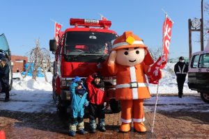 当日は、おこっぺ町の特産品の販売やお菓子撒き、スノーモービルの試乗等を目当てに大勢の来場者でにぎわっている中、会場に登場した「消太くん」は、写真撮影や消防車の試乗体験などで訪れた子供たちから人気を集めて会場を大いに盛り上げ、効果的な防火PRをすることができました。