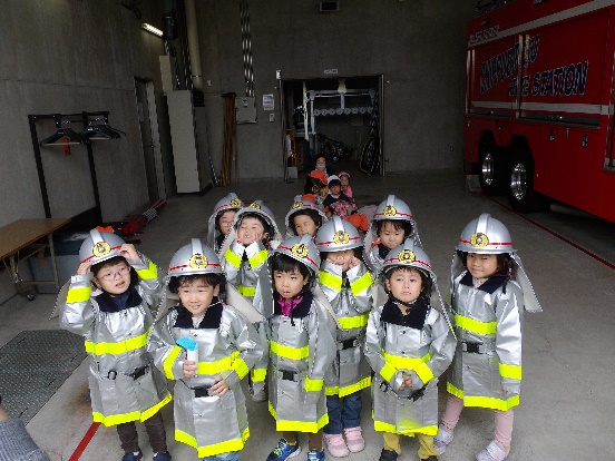 園児たちは、消防車の役割と資機材の説明後、防火衣の着装と座席試乗を行いました。その後、実際に水を通した筒先で放水体験を行い、最後は新しいタンク車を前に記念撮影を行った後に終了しました。園児たちの嬉しそうな笑顔や目を輝かせている姿を見て、私たち職員も元気をもらいました!