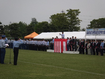 令和6年度渡島地方消防総合訓練大会が6月22日(土)13時00分から北海道消防協会渡島地方支部(金子宏之支部長・松前消防団長)主催の下、南渡島消防事務組合(池田達雄北斗市長、渡邊定美北斗団長、塩谷正仁消防長、泥川勇逸北斗署長)との共催により、「北斗市運動公園多目的広場」において開催されました。