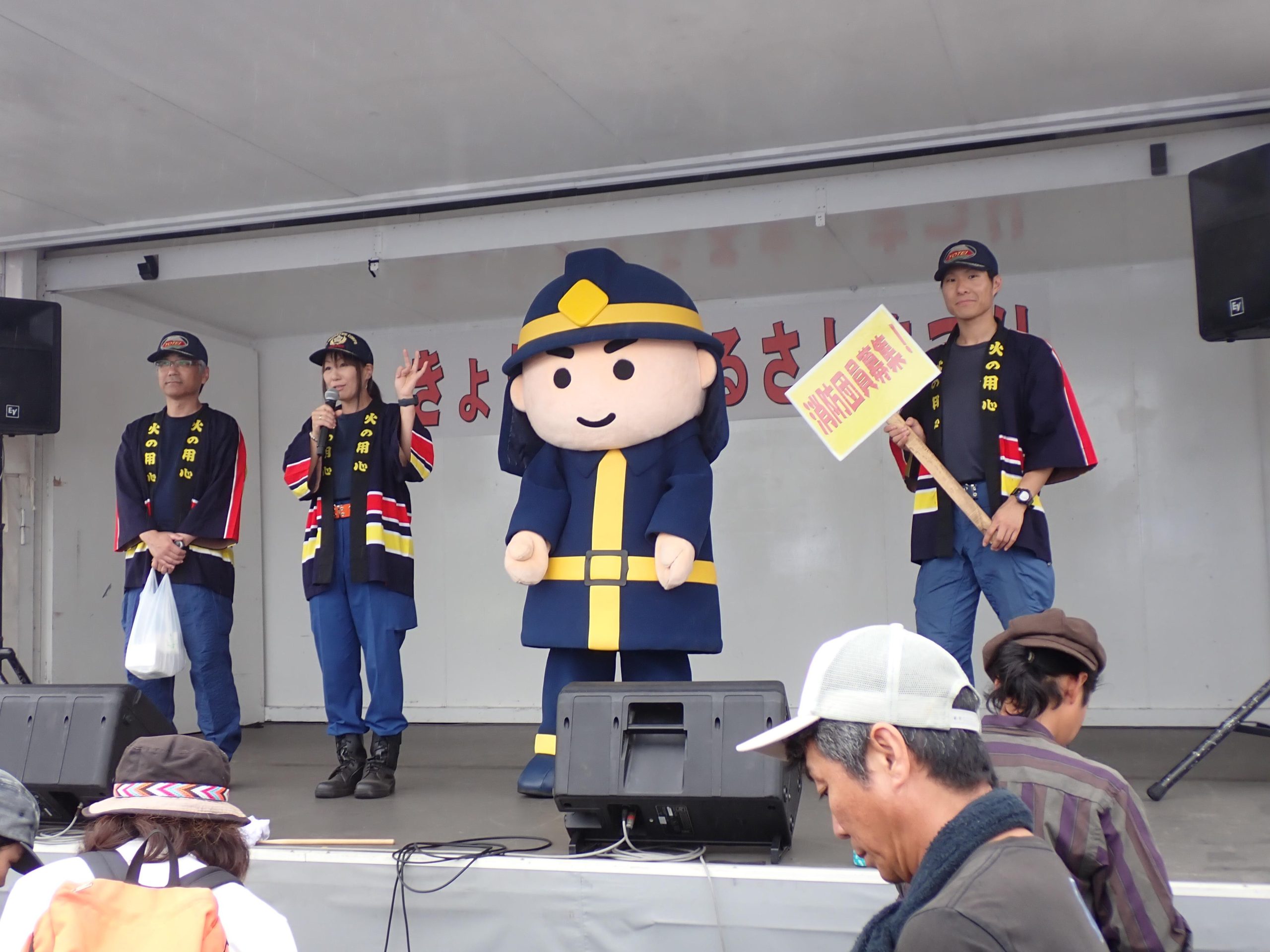 お祭りステージでは、消防のマスコットキャラクター「消太くん」が女性消防団員と一緒に消防団員募集を呼びかけました。