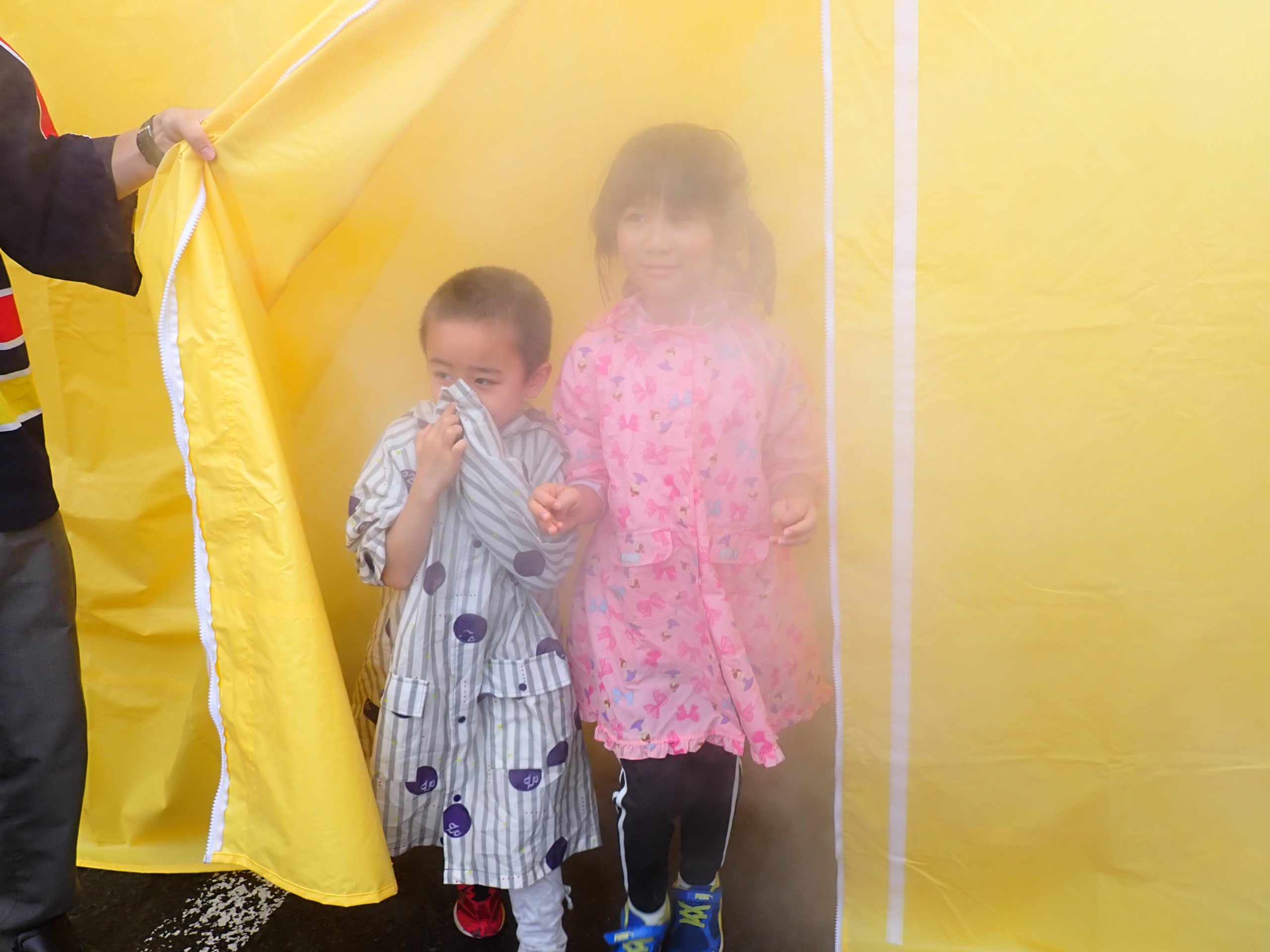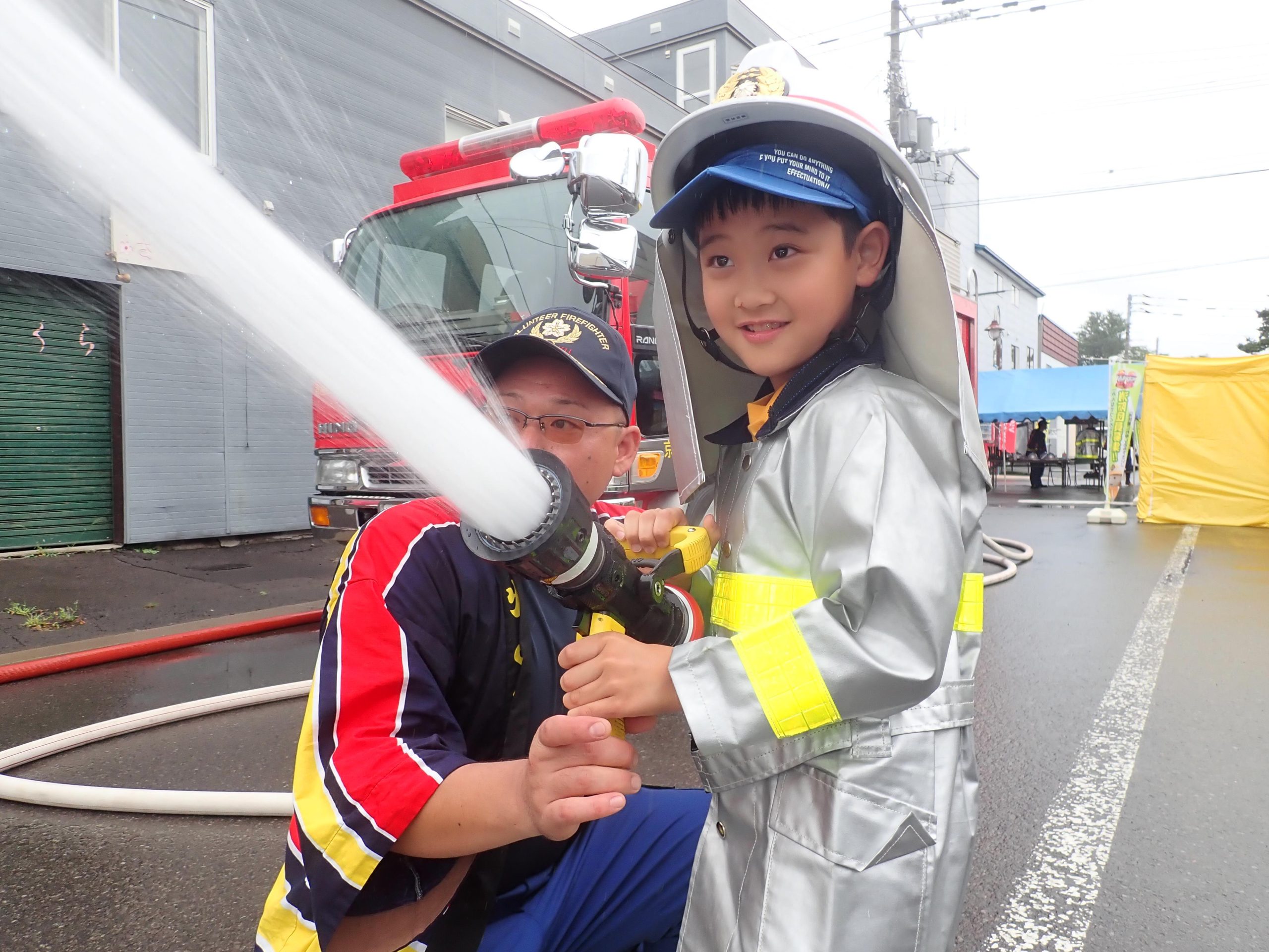 消防体験コーナーでは、防災用品・消防団員活動写真の展示や消防車に乗って記念撮影をしたり、無害な煙が充満している煙体験ハウス内を通り抜けたり、防火衣を着て放水し、的を倒すストラックアウトを楽しむ子供たちで大盛況となりました。