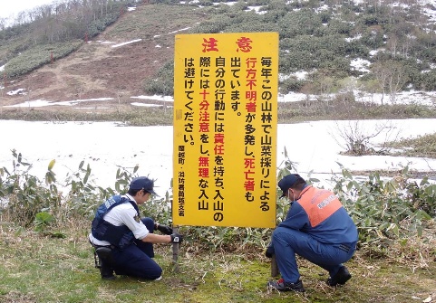 羊蹄山ろく消防組合消防署蘭越支署(支署長 大津直輝)では5月13日(火)、倶知安警察署、蘭越町役場と協力して道道沿い2か所に山菜採り遭難防止看板を設置しました。