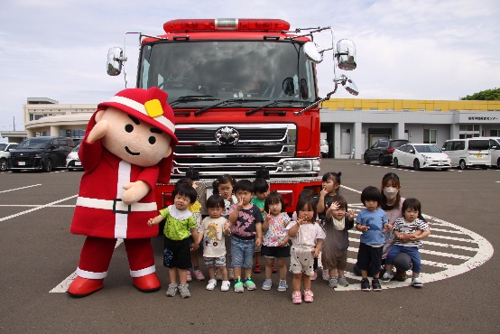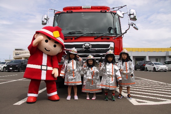 その後、保育所前で防火服を着た子供 達と消太君で写真撮影や消防車に試車