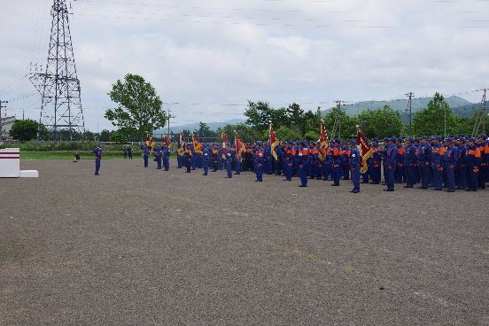 今大会では、会場の都合によりポンプ操法は実施されませんでしたが、天気にも恵まれ総勢266名の消防団員と大勢の参観者が集まり、日頃から取り組んでいる「小隊訓練」の練習成果を披露し熱い声援の中、盛会裏に大会の幕を下ろすことが出来ました。