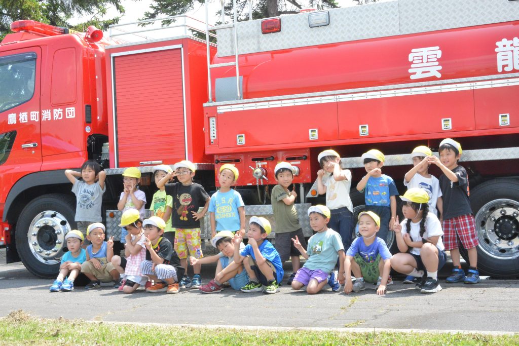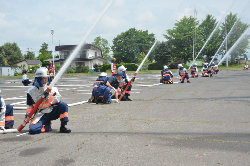 鷹栖町消防演習では分列行進、小隊訓練、ポンプ操法及び一斉放水が行われ、当日は鷹栖保育園の園児たちも招待し、園児たちからは放水に合わせ、大きな歓声が上がっていました。