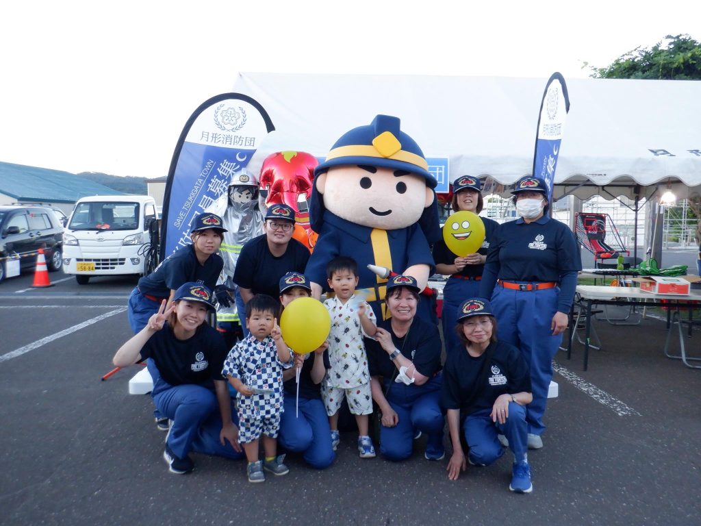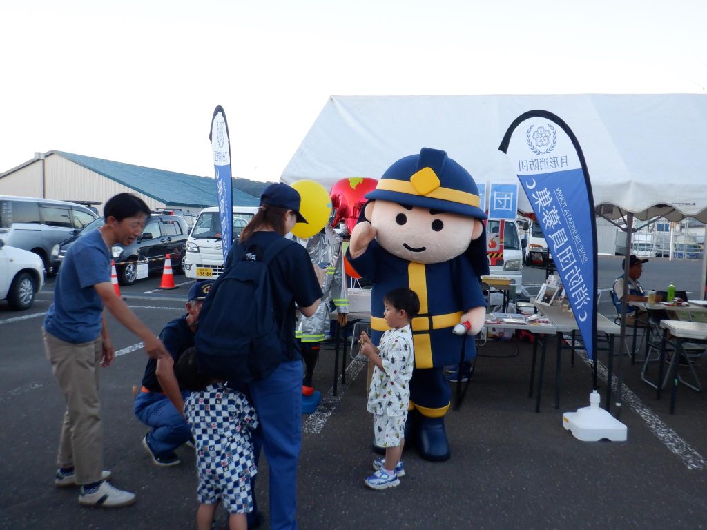 また、お子さん連れの来場者が多く見られ、会場に登場した着ぐるみ「消太くん」と消防団員を交えて記念撮影をしていました。消防団員募集PR活動において、消太くんの活躍は絶大な人気と盛り上がりを見せてくれました。