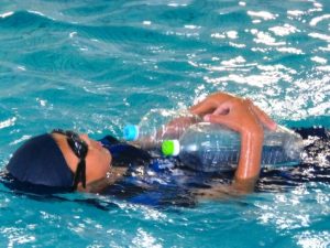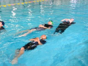 コーチから、浮いて待つことの大切さを学んだクラブ員たちは、「浮いて待つ=背浮き」の訓練に励み、空のペットボトルやランドセルを浮き具として活用する方法も経験しました。また、クラブ員たちは、服を着たまま水に入ったことで、濡れた服は重く、想像以上にとても動きづらくなってしまうことも訓練の中で体感しました。