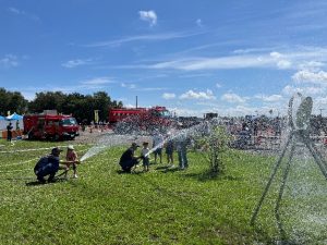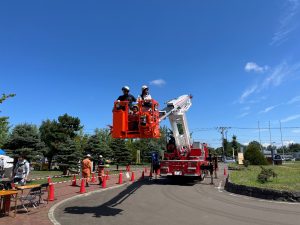 本フェスタのなかで石狩消防署と石狩消防団は、消防団車両と高規格救急車、大型高所放水車の展示と搭乗体験、40㎜ホースを用いた放水体験、火災再現・初期消火体験、心肺蘇生法体験、煙発生装置を用いた煙道体験や、各種消防キャラクターとの記念撮影コーナー、子供用防火衣を着装しミニ消防車に搭乗する記念撮影コーナーを設置しました。
