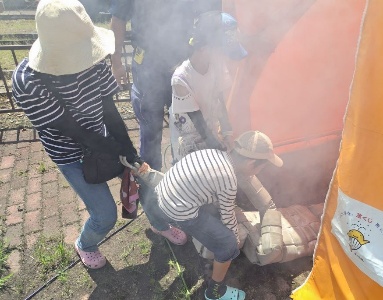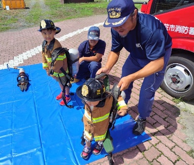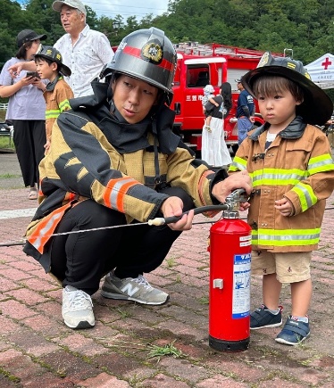 消防団員募集PRのチラシ配布をはじめ、親子での防火服着装体験、消防車への乗車体験、放水体験、水消火器による初期消火体験のほか、煙避難救出体験では煙の充満したテント内で要救助者(訓練人形)を発見し親子で力を合わせながら出口まで救出してもらい、人命救助について実感していただけたと思います。