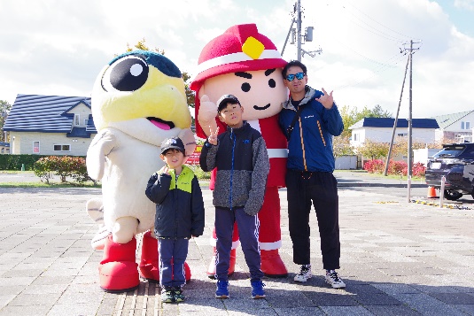 さらに、消防マスコット「消太くん」とイベント会場に隣接する千歳水族館のマスコットキャラクター「サモンくん」も参加し、啓発物品の配布や写真撮影を通じて防火意識の向上を呼びかけました。