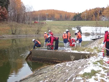 訓練内容は、山林地域での火災を想定した遠距離送水訓練を行い、消防ポンプでの吸水、ホース延長、送水・放水と消防技術として基本的な内容の訓練を行いました。