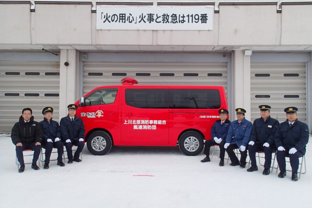 令和7年12月26日(金)、上川北部消防事務組合風連消防団に(公財)日本消防協会から防災学習・災害活動車Ⅱが寄贈されました。この事業は(公財)日本消防協会が消防防災に係る施設整備及び資機材の充実強化に関する事業として、(一財)日本宝くじ協会から助成を受け、地域住民に対する積極的な防災学習等の活動が期待できる消防団に対し、車両の配備を実施しており、各種防災学習用資機材も付属されています。